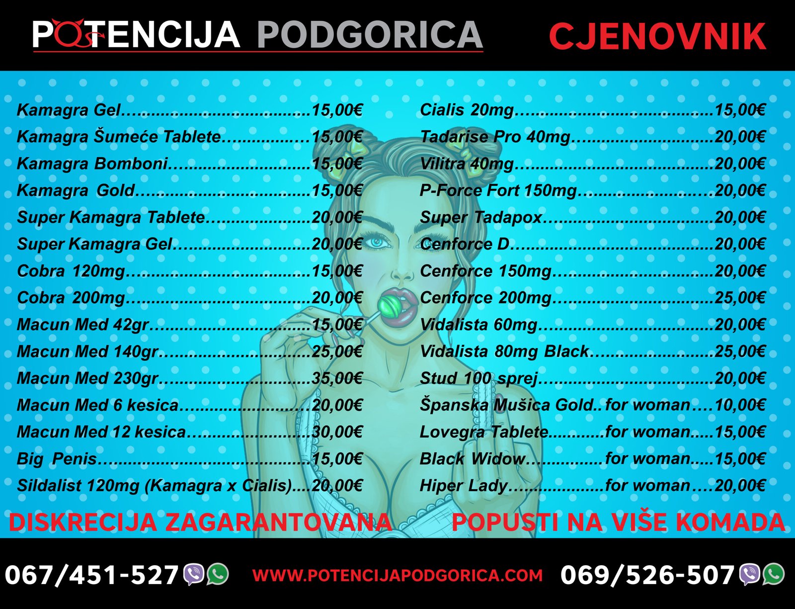 Nudimo Vam originalne proizvode po najboljim cijenama u Crnoj Gori. Uz naše preparate imate jaču erekciju, bolju potenciju i duže trajanje odnosa. Svojstvo naših preparata je dugotrajno dejstvo, brzo i jako djelovanje.